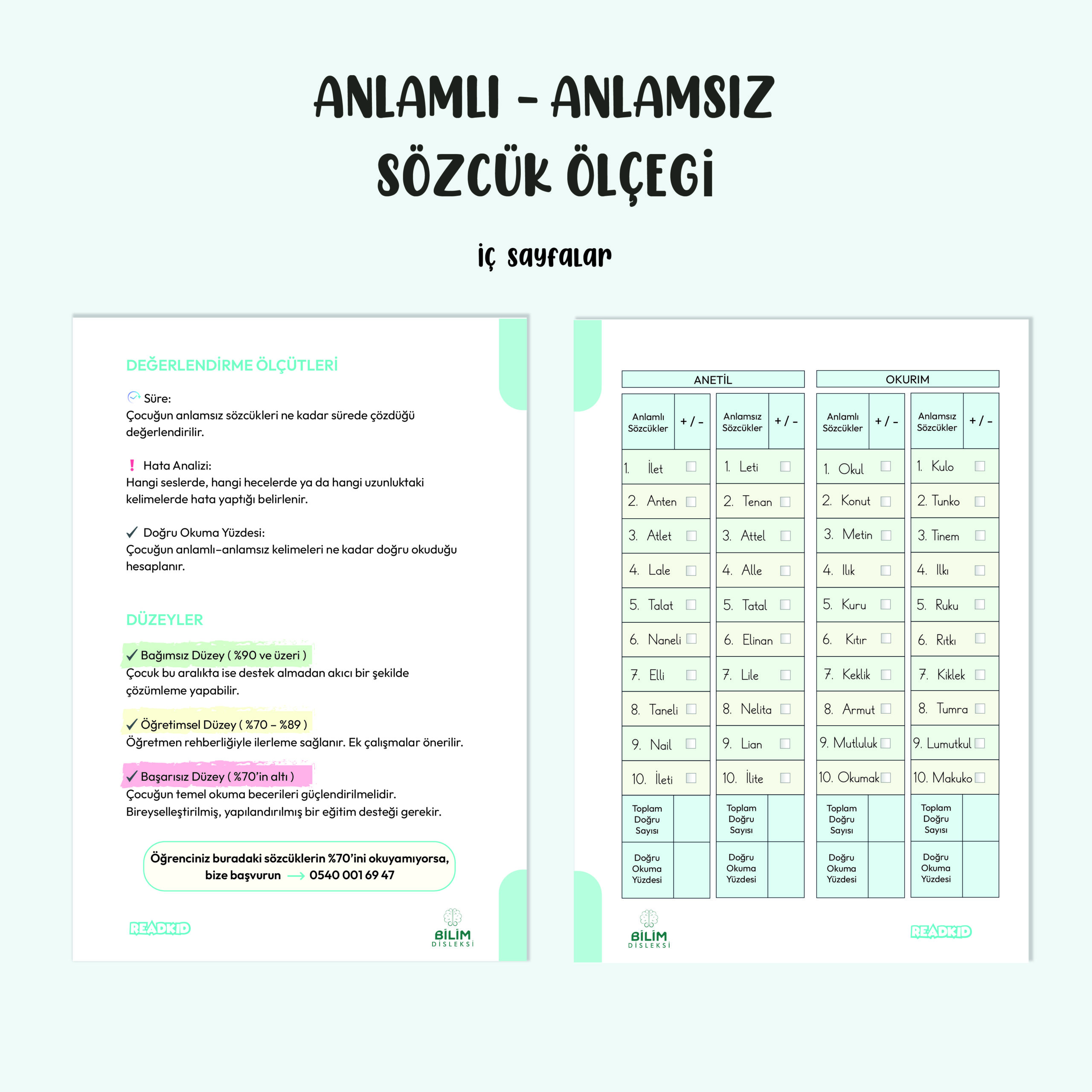 Anlamlı – Anlamsız Sözcük Ölçeği, okuma sırasında çocuğun sesleri ayırt etme, heceleme, birleştirme ve çözümleme becerisini en güvenilir şekilde değerlendirmek için hazırlanmıştır. 📚🔍